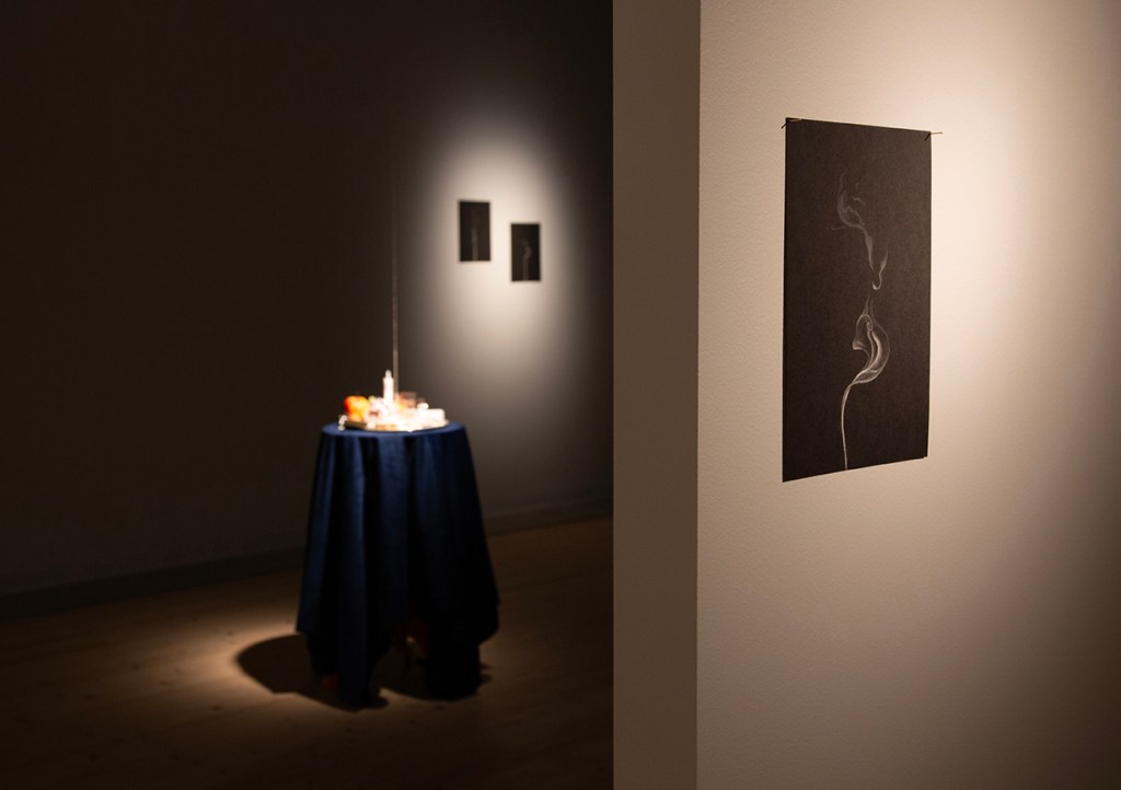Johan Thurfjells konst leder rakt in i stora och små mysterier. Hans konst rör sig bekvämt mellan ytterligheter som dröm och vaka, liv och död, ljus och mörker. Det handlar inte om själva motsatserna utan snarare om passagerna mitt emellan – ett skymningsland, där definitionerna rämnar, tiden förseglas och där människor och andar glider in i varandras världar.