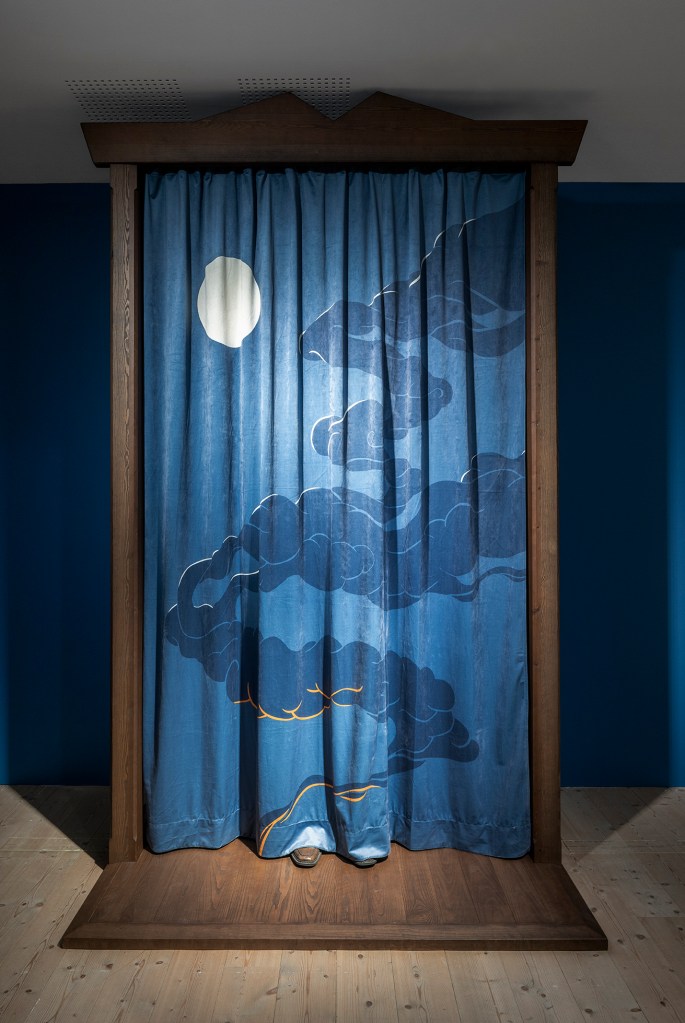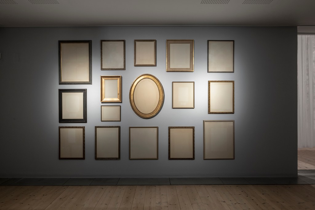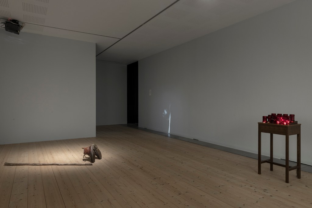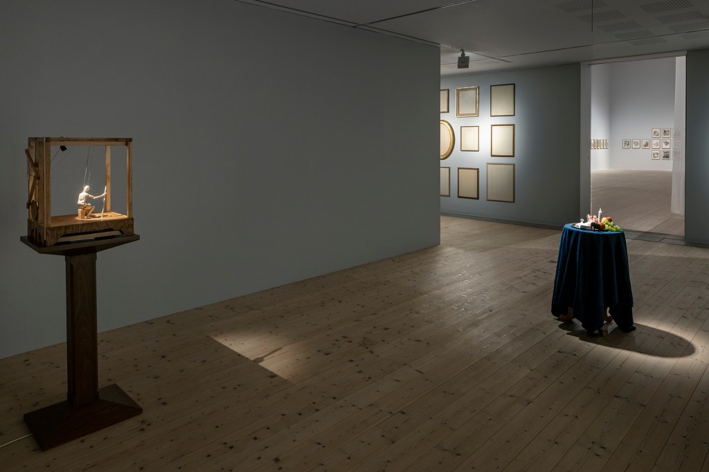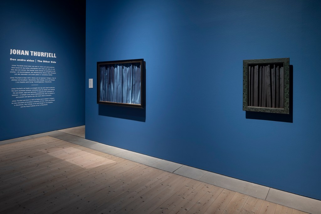 Fingerfärdighet genomsyrar Johan Thurfjells verk. Han målar, snickrar och snidar träskulpturer som genom mekaniska inslag utför enkla, upprepade rörelser. Hans skicklighet med papper och olika sortens pigment är omisskännlig. En vägg täcks med rader av tavelramar. Först osynliga motiv, som omsorgsfullt målades med kaffe, träder spöklikt fram. Den blåa gardinen, som på olika sätt återkommer, är i sig en symbolisk gräns. Ett par herrskor sticker ut och rör sig under ett draperi, som om någon gömde sig bakom det. Ljudet av ett ekollon, som oväntat faller ner i en metallhink, framkallar en rysning. Det visuella samspelar med det akustiska i en fantasieggande scenografi som besökare fyller med sin närvaro.