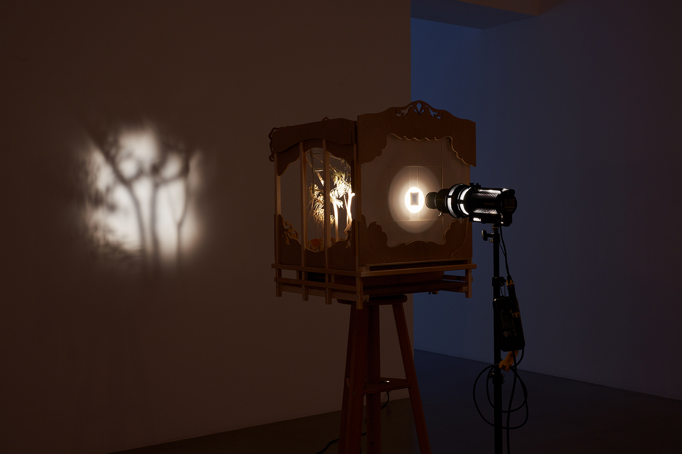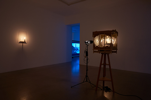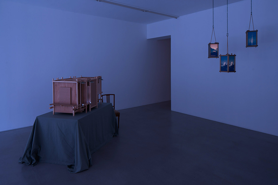 Tid och ljus spelar betydelsefulla roller i Thurfjells utställning. I det blåa ljuset framkallas det som inom japansk folktro kallas för oxtimmarna, tiden då gränsen mellan de levande och de dödas värld är som tunnast. I verket The hour of meeting evil spirits, har olika japanska träsnitt förts samman till en sömlös animation där betraktaren färdas genom ett dimhöljt landskap mot skymningen. Projicerad på ett tunt, blåfärgat tyg svävar animationen som ett spöke i rummets mitt.