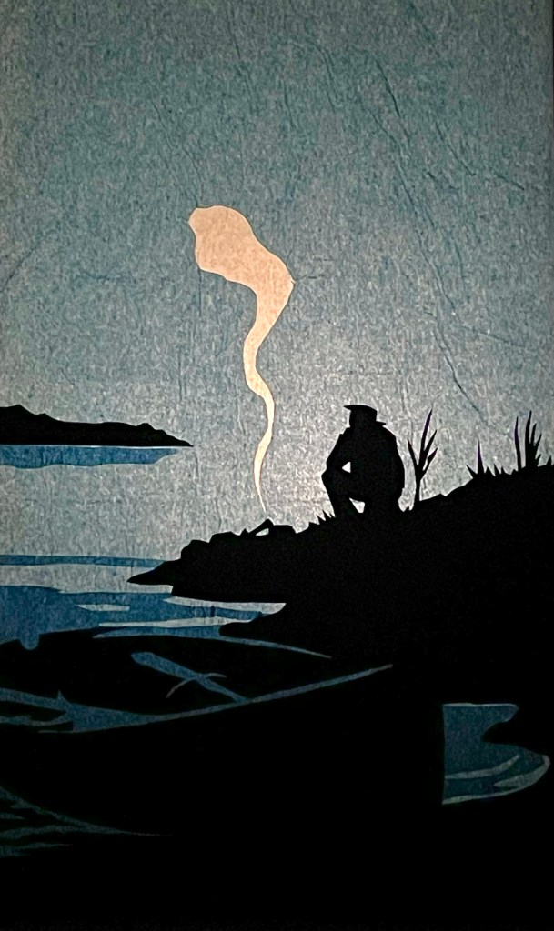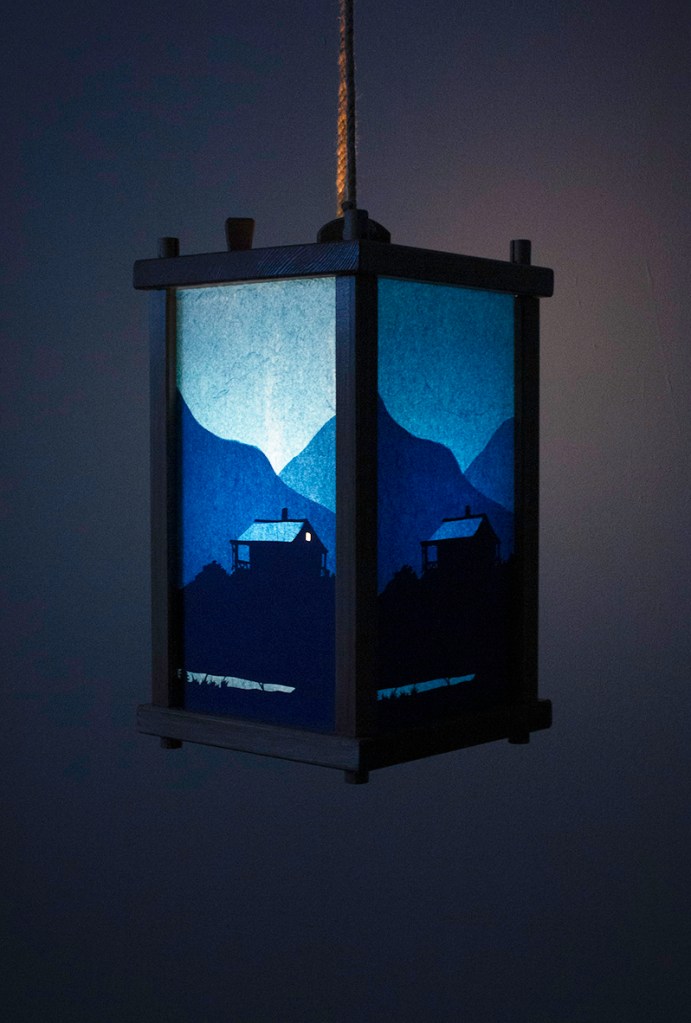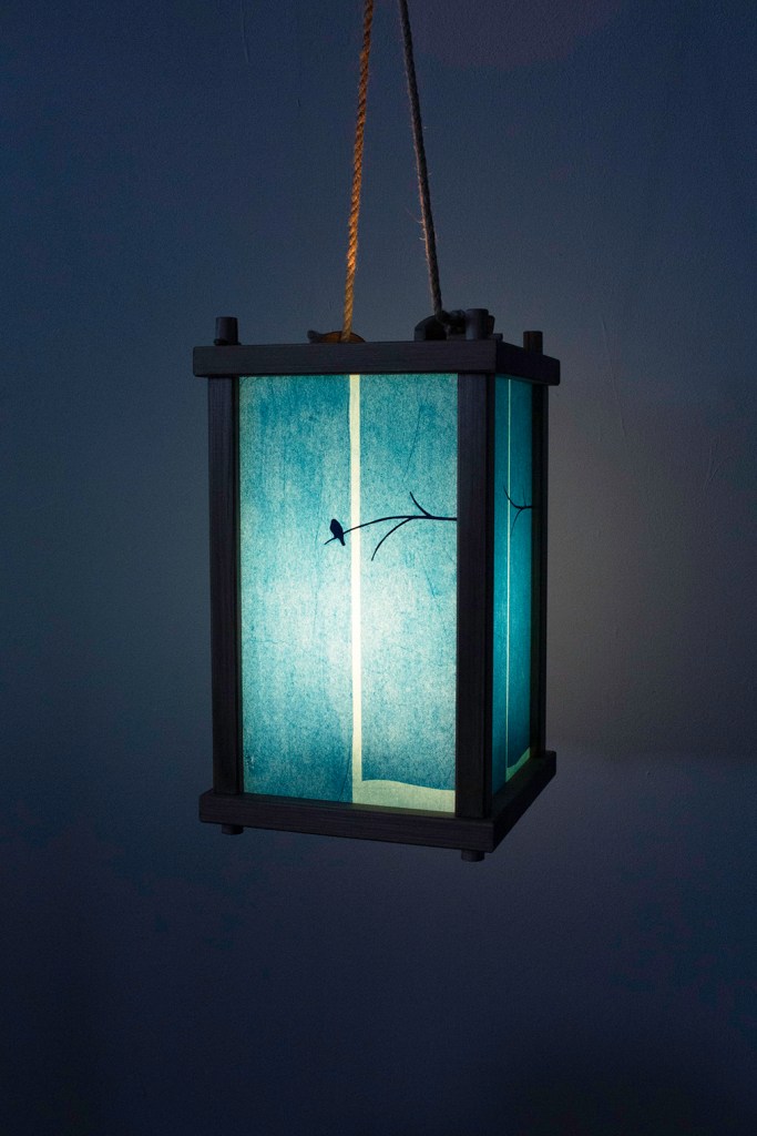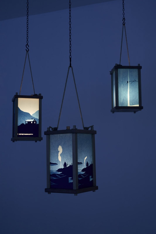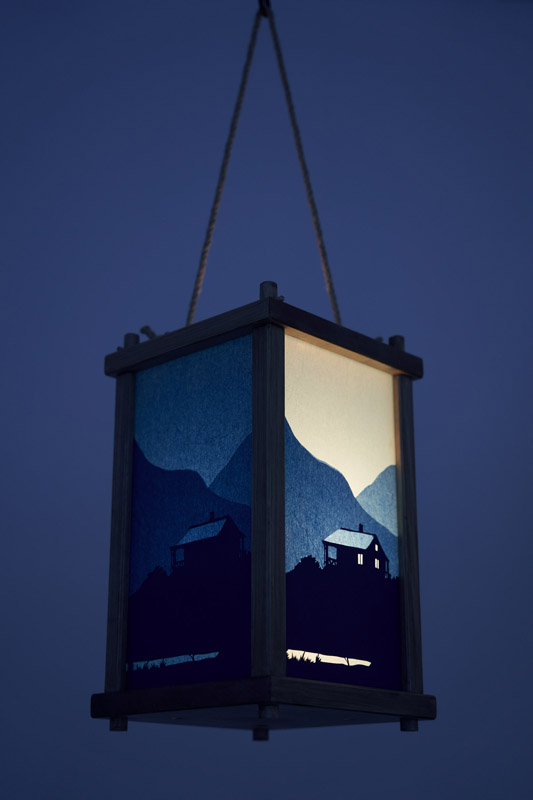 Dusk är inspirerat av den här spökceremonins blå lyktor. På lyktornas sidor framträder lågmälda narrativ; en fågel som lämnar sin kvist i skymningen, en man vid en slocknande lägereld, ett hus där rum efter rum släcks inför natten. Bilderna är utförda i decoupage-teknik, klippta papper limmade i lager på lager på lyktornas glas.