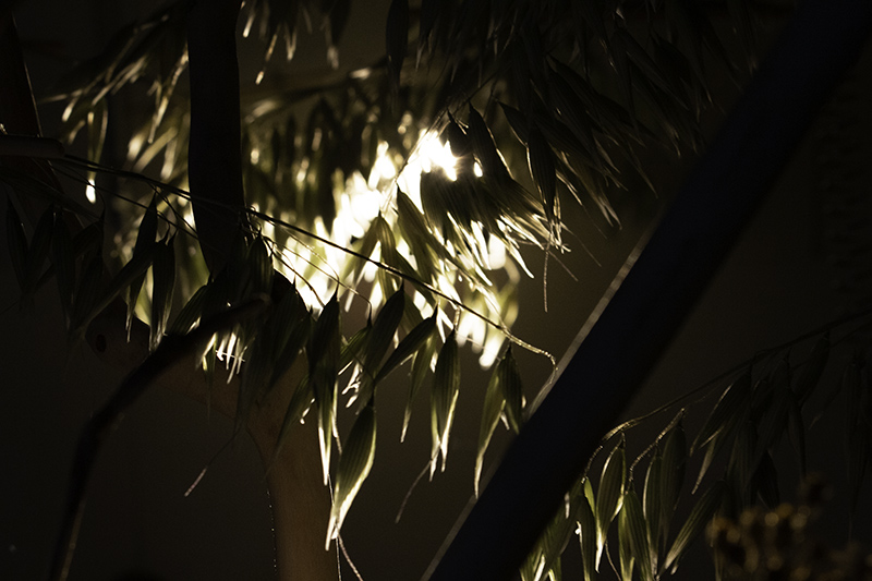 Lövteatern är influerad av teatern som magisk maskin. Till skillnad från det i vanliga fall dolda illusionsmakeriet på en teater är själva maskineriet här i fokus och helt öppet för betraktaren. Skulpturen består av en utsmyckad träkonstruktion, som ett rum med öppna väggar, med en roterande platta i botten. Små flaggor fästa på plattan stöter till hängande spiralfjädrar i vilka det sitter vippor av havre. En lampa på ett stativ lyser igenom lagren av gungande havrevippor och skapar ett drömlikt skuggspel på väggen.