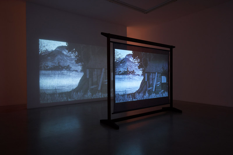 The hour of meeting evil spirits är en tjugo minuter lång animation som projiceras på ett blått halvtransparent linnetyg. Tyget hänger i en träkonstruktion mitt i rummet och filmen slår genom tyget och uppträder i dubblett som en urvattnad skuggbild på väggen bakom. Filmen är uppbyggd av ett trettiotal digitalt bearbetade japanska träsnitt från tidigt 1800-tal. Vi reser från havet in över ett dimhöljt landskap. Vi ser skogar, kullar och spridda byggnader passera på väg upp mot bergen. Vi svävar längs folktomma gator, in på bakgårdar, igenom ödelagda hus innan vi svävar ut över havet igen.